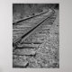 Fotografia a preto e branco de uma pista rusticária que se curva em torno da curva
