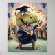 Esta é uma imagem gerada por IA. Gostei dessa imagem porque o T-Rex está sorrindo e há o texto felicitando o formando quase acima do diploma.