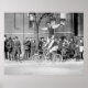 Foto antiga de Herbert Bell & Joe Garso, ciclistas de truques de uma perna, fazendo truques de bicicleta para uma multidão. Fotografia tirada em 1921.