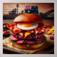 Conquiste a sua fome com este hambúrguer de Tucker Burger. Um pedaço grosso de carne de canguru, grelhado à perfeição, é tocado com um ovo frito, fatias vibrantes de beterraba, bacon estaladiço e uma generosa garoa de molho de churrasco de enfumaçado, todos aninhados dentro de um rolo úmido torrado. Uma pequena bandeira australiana adiciona um toque de espírito Outback, enquanto um pano de fundo do horizonte de Sydney completa esta aventura culinária australiana.
