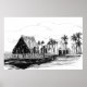 A black and white poster print featuring a setting inspired by the Big Island Hawaii with huts built near the water and rows of palm trees and large fluffy clouds hand drawn with various inks.