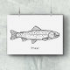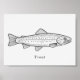Um poster com uma ilustração de uma truta em arte de linha e mensagem de texto abaixo: arte perfeita em parede para decoração de escritórios, escolas ou casas. Será também um presente perfeito para um pescador, um guia de pesca, um amante do peixe, etc.