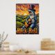 Esta pintura cativante apresenta um tubarão azul "groovy", completo com um chapéu de cima e óculos de sol vermelhos, engajado em uma "ouro hora" em um violão elétrico. Fica em um terreno rochoso, ignorando uma paisagem de colinas verdes e árvores sob um atordoante céu ensolarado texturizado. A técnica vibrante e imprópria cria uma atmosfera viva e entusiasmante, transmitindo perfeitamente a vibração "ROCK and ROLL".