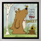 Um urso bonito fica perto de uma colmeia que está sentada num toco enquanto uma abelha se senta na ponta do nariz do urso. A imagem do Woodland com um trocadilho iluminará seu coração. design original de Christie Black of Creations do Heart.