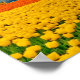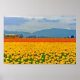 Foto de um campo de tulipas amarelas e laranja com um ônibus escolar laranja estacionado no final dos campos das flores e das montanhas à distância. Esta foto de tulipas foi tirada no Festival de Tulipas do Vale do Skagit, no estado de Washington, EUA. Os leitos coloridos de tulipas se esticam quase até onde o olho pode ver. Você pode ter esta foto de tulipas impressa em vários produtos personalizáveis diferentes.