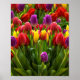 Este belo design apresenta uma imagem de alta definição de tulipas em vários tons brilhantes de vermelho, roxo e amarelo. As tulipas cresceram originalmente na Ásia Central e foram vistas como um símbolo do Império Otomano, no entanto, no século XVI elas foram importadas para a Europa e logo se tornaram altamente valorizadas como um bem valioso. Eles se associaram à Holanda, onde muitas flores foram cultivadas e comercializadas nos mercados. Muitos híbridos e cultivares bonitos, em todos os tipos de cores maravilhosas, foram criados desde então.