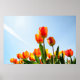 Poster impressão de flores compostas por tulipas laranja e vermelha vistas de um ponto de vista baixo contra um céu azul.