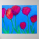 Essas flores vibrantes e maravilhosas me lembram da minha infância crescendo no meio-oeste superior! Minha mãe plantava tulipas todos os anos pelo tempo que eu conseguisse lembrar. Mal podia esperar para vê-los aparecendo no nosso quintal junto com os lilases, violetas africanas e vegetais no seu jardim. Vermelho, magenta, laranja com um belo céu azul como pano de fundo nesta pintura moderna.