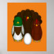 Um desenho animado Turquia, Pato, Galinha e ovo como um conjunto de bonecas russas que nidificam matryoshka. O peru é castanho-escuro com olhos verdes, o pato tem uma cabeça verde e um corpo castanho e branco e olhos azuis, e o frango é castanho-avermelhado com olhos amarelos.