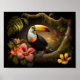 Toucano ilustrado nos ramos de árvores cercados por flores tropicais vibrantes em uma floresta tropical.