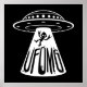 Vetor cartoon ilustration of a UFO abduzindo uma pessoa que pensa que os aliens se apodrecem com o texto da UFOMG. Etiquetas: OVNI, OMG, não identificado, voando, objeto, oh, meu Deus, espaço, espaçonave, alienígena, marciano, desenho animado, diabo, chifres, rapto, quarto, tipo, humor, disco