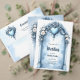 Um arco azul-claro-ornamentado com sotaques florais, um emblema cardíaco e rosas. Descubra uma galeria elegante com duas colunas com um topo saltado, ricamente enfeitado com entalhes intrincados e um emblema central em forma de coração. As rosas brancas com matizes de pêssego, folhas delicadas, e pequenas flores brancas moldam o portal incrivelmente desenhado. Ideal para apresentações de empresas ou produtos, casamentos ou designs de eventos que combinam romance clássico com esquemas de cores modernos.