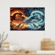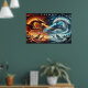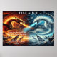 Uma cena de fantasia épica retrata um dramático choque de elementos: fogo e gelo. Dois dragões míticos, um amontoado em chamas, o outro a zimbar com gelo, encaram-se uns aos outros. O dragão de fogo, balanças brilhando como lava derretida, voa através de um céu feroz. O dragão de gelo, brilhando em tons de azul e branco, emerge de uma terra gelada. O fundo é um contraste impressionante entre fogo e gelo. "FIRE & ICE" é exibido com destaque no topo