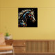 Um retrato lateral de um cavalo espantoso no estilo de abstrato. Este trabalho de arte apresenta uma técnica de vidro manchado artístico com linhas de ouro, recheadas de tons vibrantes vermelho, azul, laranja, preto e prateado sobre um fundo escuro. O resultado é um retrato majestoso de um garanhão exuberando esplendor real.