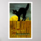 Ilustração Vintage Halloween mostrando um gato preto em uma cerca com um rosto-de-lua atrás.