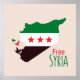 Um design com a bandeira da Revolução Síria dentro no mapa da Síria, com pombos de paz e a frase "Liberdade na Síria".