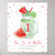 primeiro aniversario temático "one in a melon" com ilustração de um limão de melancia liso em mason jar cercado por confetti.