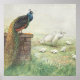 Um Pavão Azul empoleirado em uma parede de tijolos enquanto ele assiste sobre sua pavoa branca enquanto ela e seus pintinhos se alimentam da grama Este design Adorável está neste Poster x 24", O tamanho dos posters pode ser mudado para atender às suas necessidades.