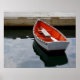 Um bote laranja brilhante se senta nas águas calmas do porto