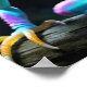 Um réptil de cor vívida com uma mistura de matizes vibrantes, incluindo verde, azul, amarelo e rosa, é empobrecido sobre um pedaço de madeira, destacando-se contra um fundo escuro e turvo. As escalas detalhadas e os olhos impressionantes melhoram a aparência cativante da criatura.