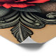 Um romance gótico. Um quadro em estilo gótico e ornamentado ao redor de um fundo bege. As rosas vermelhas com folhas verdes escuras são dispostas ao redor do quadro, principalmente nos cantos. No centro inferior, há um emblema decorativo em forma de coração com a palavra "LOVE" inscrita em uma fonte estilizada.