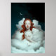 Ilustração de uma mulher cabeleira vermelha com um gato branco nas nuvens, sob a lua, no estilo da arte digital