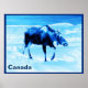 Imagem monocromática (azul) de um alce de vaca a andar na neve. O texto "Canada" também é exibido. Moose são residentes em muitas comunidades nortes ao longo do ano. Aqui em Anchorage há cerca de 1500 animais, juntamente com lobos, ursos pardos e outros animais selvagens. Eles são geralmente bem comportados. Muitas vezes atravessam as ruas nas passagens de pedestres, depois de esperarem por um sinal de caminhada.