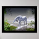 Um magnífico Unicórnio bebe de um legal riacho montanhoso nesta pacífica ilustração da Lua Unicórnio. A lua sobe sobre as montanhas cobertas de neve e um bando de gaivotas procura a água por comida.