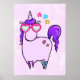 Um poster com um desenho caprichoso de um legal e funk unicórnio rosa, que tem um homem roxo e um conto. Esta criatura fofinha está vestindo óculos de sol em forma de coração e é decorada com estrelas pequenas. Fundo de aquarela rosa. Perfeito para um quarto de meninas.