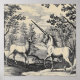 unicórnio mítico encontrando um veado na floresta, publicado no Livro da Lambsagem, repleto de imagens alegóricas da meia-idade mostrando destilação e extração de ouro puro de metais comuns em laboratório de alquimia.