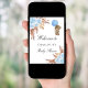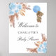 Um poster de boas-vindas para um chá de fraldas elegante e moderno. Um fundo branco, uma erva pampas de estilo "boho", florais azuis claros e um ursinho de peluche segurando um balão azul. Personalize e adicione um nome.