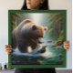 Uma pintura mostrando um urso e um peixe graciosamente entrelaçados em um rio. O urso está se aproximando do peixe enquanto ele elegantemente se natação contra a corrente, criando uma cena harmoniosa e cativante.