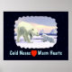 Um filhote de urso polar procura garantias da sua mãe no pacote de gelo ártico. O texto "Noses frias Corações quentes" e um coração vermelho também aparecem. Tudo num fundo estelar.