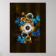 Composição do relógio de aço redondo com discagem numérica romana preta, decorado com engrenagens de ouro e latão, borboletas morfo azuis e lentes danificadas sobre fundo listrado castanho. Estilo Steampunk.