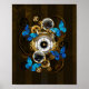 Composição do relógio de aço redondo com discagem numérica romana preta, decorado com engrenagens de ouro e latão, borboletas morfo azuis e lentes danificadas sobre fundo listrado castanho. Estilo Steampunk.