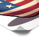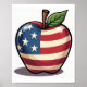 Uma ilustração de uma maçã com o padrão de bandeira dos Estados Unidos em cor de cheio. O lado esquerdo da maçã apresenta estrelas brancas sobre fundo azul, enquanto o lado direito exibe faixas vermelhas e brancas. A maçã propriamente dita deve ter um contorno liso e ousado, sem sombras ou gradientes, e o caule e a folha devem ser um verde natural. As cores devem ser vibrantes e claras, com um design simples e nítido