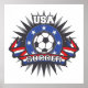 Um equipamento de futebol americano patriótico com bola de futebol no centro, com texto superior e texto inferior de futebol nos EUA, em faixa branca e azul lida!