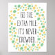 Decorre sua casa, escritório, apartamento, dormitório, creche, ou até sala de aula, com este poster fofo e na moda. Esta poster apresenta bolinhas bonito de menta e pêssego com texto inspiracional que diz, "VÁ O MILHO EXTRA. NUNCA ESTÁ ATRASADO." Este é um design muito único que você não encontrará em nenhum outro lugar! Esta é a poster perfeita para ser apresentada num gabinete de conselheiro de orientação! No entanto, penso que também seria bonito em qualquer lugar. Se você quiser adicionar seu próprio texto ao design, clique no botão "Personalizar" e o Zazzle permitirá que você faça isso facilmente. Este poster está disponível em vários tipos de papel e em vários tamanhos para atender às suas necessidades. Posters Zazzle são de qualidade fabulosa, por isso sei que ficará satisfeito com a sua compra! Compre um quadro para o poster fazer com que pareça ainda melhor quando estiver pendurado em sua casa. Por favor, envie-me uma mensagem se tiver alguma dúvida ou preocupação em relação à design deste produto.