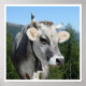 Fotografia de uma vaca com um sino em volta do pescoço com montanhas ao fundo.