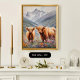 Esta poster é uma pintura de duas vacas de terras altas em uma paisagem natural. As vacas têm pelo longo e chifres, e estão cercadas por flores coloridas. O fundo mostra uma cordilheira com neve e névoa. O poster tem uma paleta de cores suave e serena. 🎨