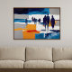 Esta evocativa obra de arte abstrata captura um momento fugaz após uma tempestade, onde figuras se movem silenciosamente por uma paisagem aberta e lavada pela chuva. Silhuetas simplificadas caminham por planos sobrepostos de azul, cinza, branco e ocre quente, sugerindo solo molhado, nuvens se afastando e a luz lentamente retornando ao céu. A composição parece espaçosa e contemplativa, equilibrando tons atmosféricos frios com um calor sutil sob a superfície.