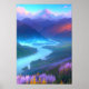 Esta impressionante obra de arte digital oferece uma visão impressionante de um belo vale do topo de uma colina. No centro do vale, um belo rio enche a paisagem, parcialmente coberto por uma fina neblina azul que cria uma atmosfera etérea e de outro mundo.