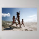 família correndo para a praia