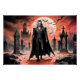 vampiro escuro está em um cemitério de areia debaixo de uma lua de cheio, cercado por morcegos e um castelo assombrado no fundo.