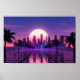 Uma imagem impressionante ao estilo vaporwave, que apresenta uma paisagem urbana iluminada por neon com palmeiras de polígonos baixos e uma rede digital refletiva. Essa design combina uma paisagem retrorfuturista com a estética dos anos 80 e 90, criando uma peça única e nostálgica perfeita para fãs do gênero.