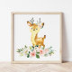 Poster Veado, Animais Da Floresta, Boho, Flores Rosa