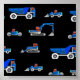 fundo preto com caminhões azuis, brancos e vermelhos de construção, tratores, escavadoras, Roller