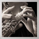 Esta pintura hiperrealista extremamente detalhada de Jeff Bartels sobre petróleo retrata um homem tocando flauta. A imagem bem cortada, preta e branca apresenta os dedos do flautista na flauta com seu rosto no fundo. Luz forte e sombras junto com o corte apertado dão a esta pintura uma sensação impressionante e dramática.
