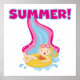 Um design bonito para o verão, mostra uma menina loira de cabelos no biquíni e anel descendo o diapositivo de água e texto rosa quente e azul que lê SUMMER! T-shirts de Verão, fatos-chave, bíblias, canecas, cartões, bolsas, autocolantes, guardas, travesseiros e muito mais.