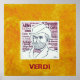 Um retrato de Giuseppe Verdi, o compositor italiano excelente. O fundo lista algumas de suas obras mais conhecidas, como Aida, La Traviata, Nabucco, Rigoletto etc.
